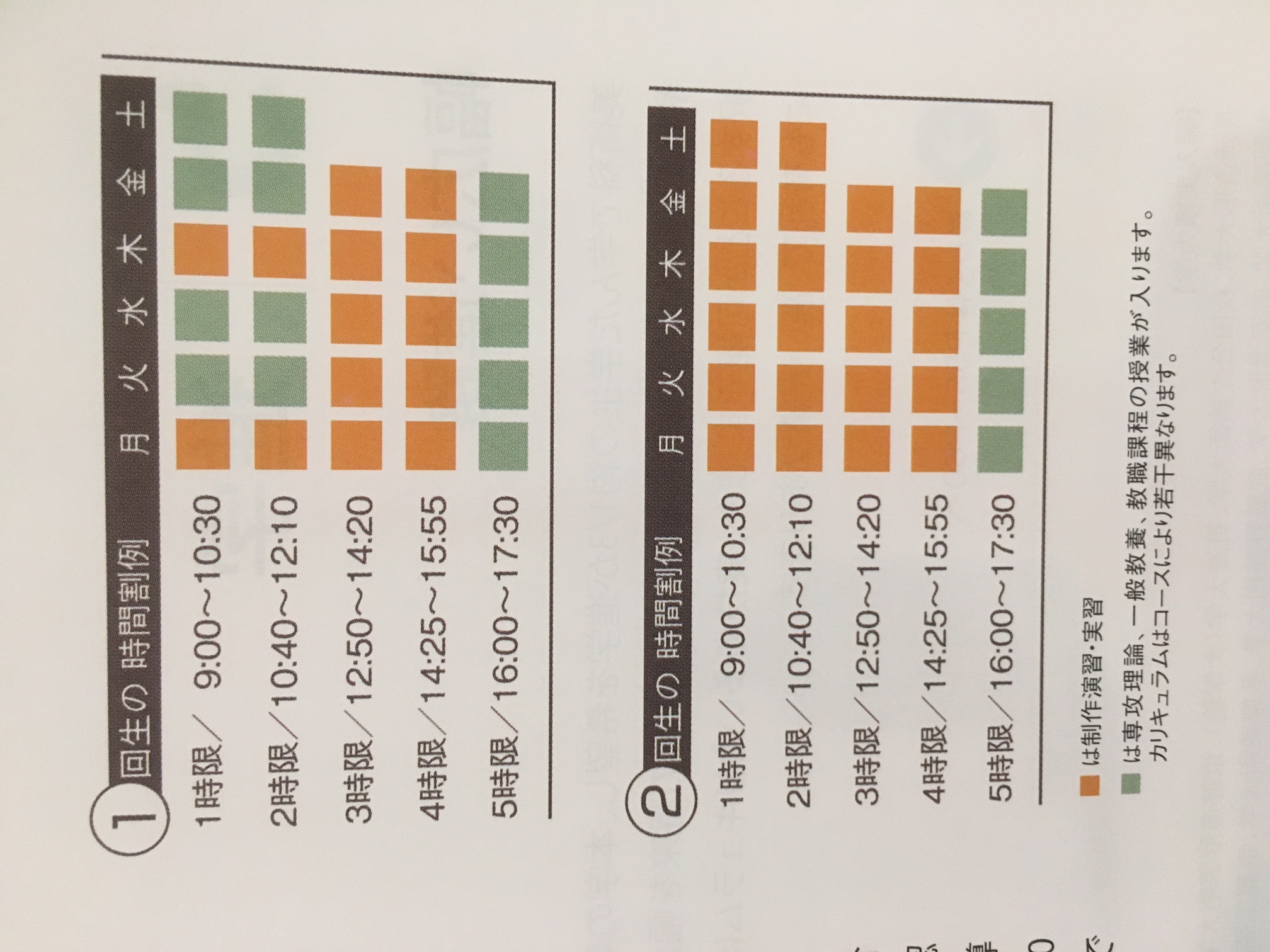 確かに忙しいです… が、短大だからこその学びがあります。 これは、奈良芸の1回生、2回生の時間割例です。 オレンジが実技の時間です^ ^たまらんでしょ⁉︎ チャイムも鳴らず、ずっと制作に打ち込めます! 緑が学科の時間ですが、短大の良い点は、四年制大学より学科の時間が少なくて良いところです。 その分、土曜まで毎日授業がありますが、集中して学べます。また、奈良芸では、入学した時からコース制で学ぶので、自分の選んだコースで深く学べます。 また、16:00〜17:30が緑で詰まっているのは、奈良芸では、中学校の教員免許が取得できる為、取得する人のバージョンで書いてあります。取得しない場合は、数コマの空き時間となります^ ^ 奈良芸では、エントリー入試(AO入試)を昨年始めましたが、始めた経緯としては、高校で美術の先生がおられない、美術の授業が無い、塾に行けないなど、芸術の道に進みたいが学ぶ機会に恵まれなかった人にチャンスを!ということで始めました。 なので、夏の時点で合格決定したら、入学までの6ヶ月間を奈良芸が通信教育の様なカタチで鍛えます^ ^ それでも、入学した時点でのデッサン力の差などは大きく感じるかもですが、奈良芸は少人数なので、力のある学生にはドンドン先へ、これからの学生には、丁寧に対応できるので大丈夫です^ ^ なので、素直に頑張れば非常に成長出来ると思いますよ!