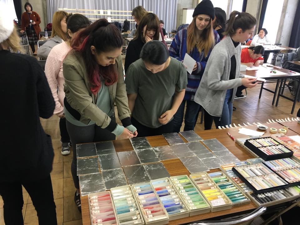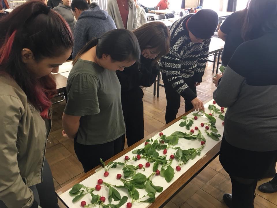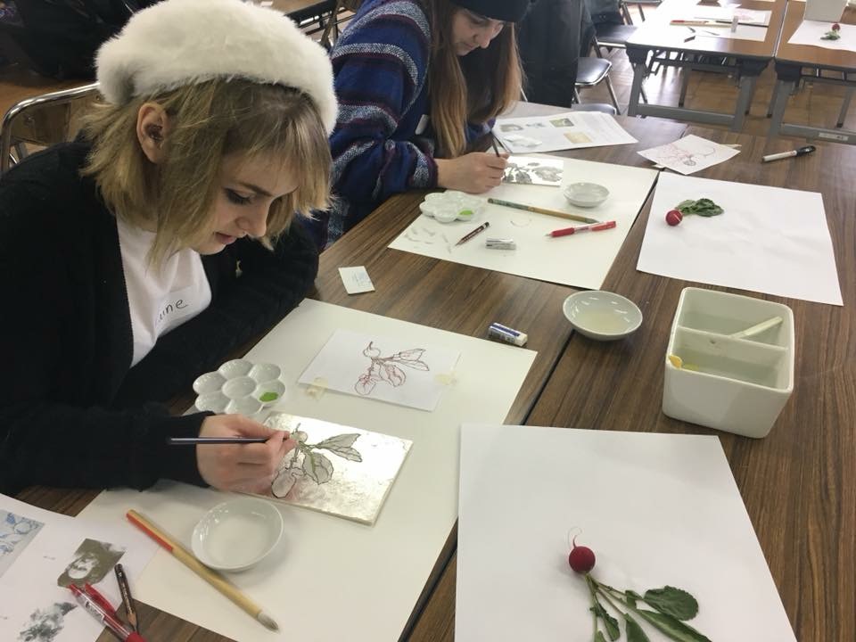 アメリカにあるレスリー大学の学生と国際交流! http://www.lesley.edu/ 奈良芸を見学して、本学の学生と一緒に日本画を体験! モチーフのラディッシュの声を聞きながら心で描いています!